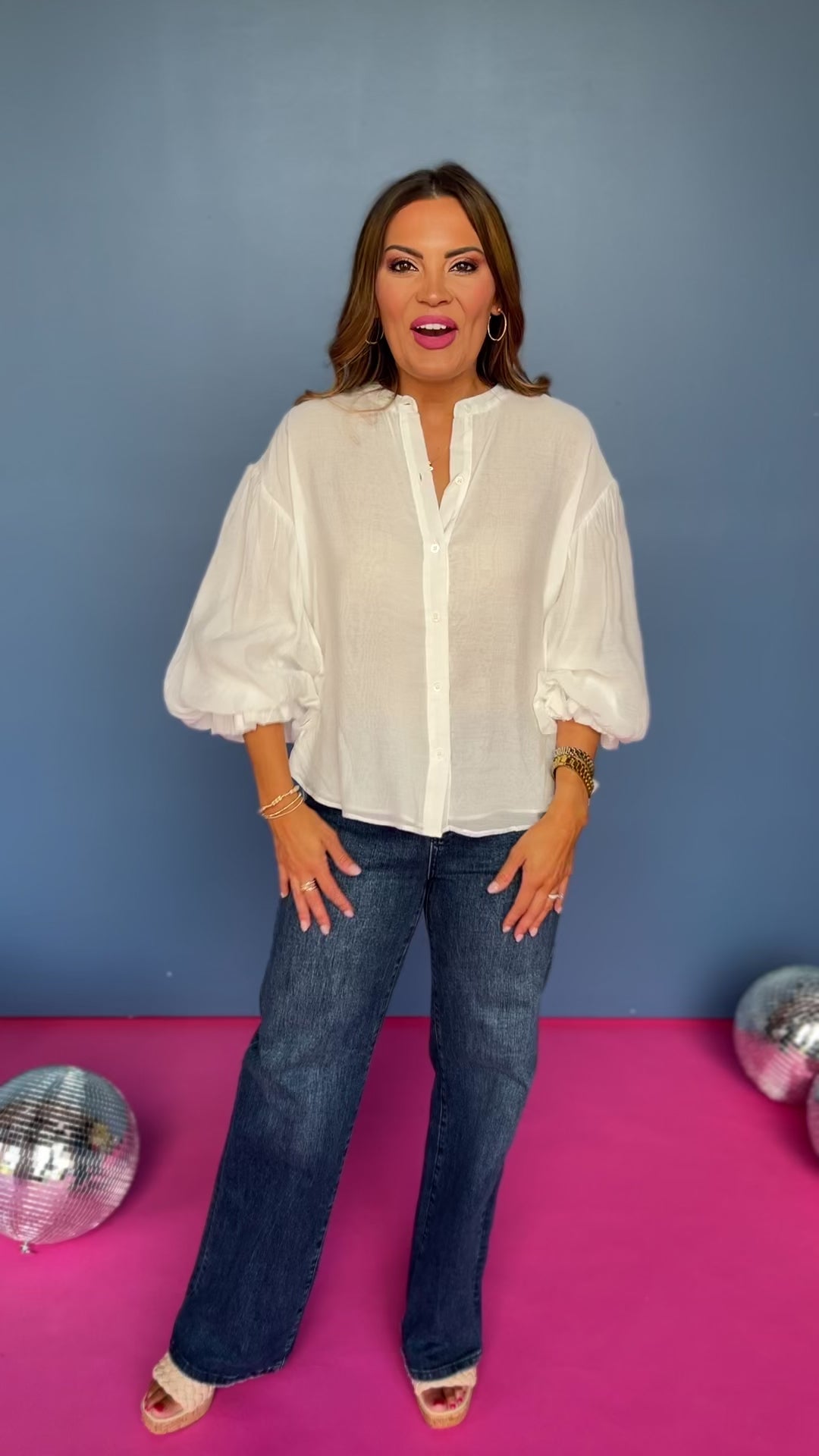 Elevate your wardrobe with this chic White Button Down Puff Sleeve Top. Embrace the classic button down style with a playful twist of long puff sleeves. Perfect for any occasion, this shirt is the ultimate versatile piece. Add a touch of fun and fashion to your look by styling with your fave denim for an effortless OOTD! Shop our in stock DENIM and SHOES to polish your ensemble.