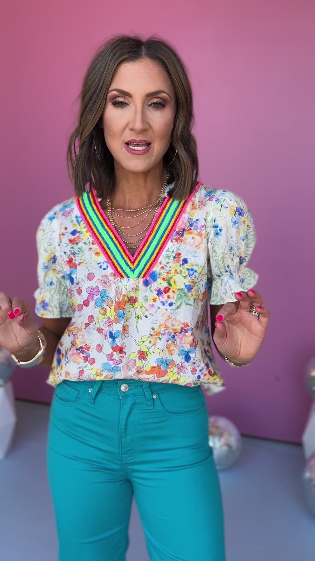 Introducing the White Multi Color Rope Trim V Neck Floral Printed Top! This unique top features a charming floral print and trendy multi color rope trim along the V neckline. This top will make a statement no matter how it is styled. We see our gal pairing with cropped denim (regular or colored) and turning heads as she goes about her day!