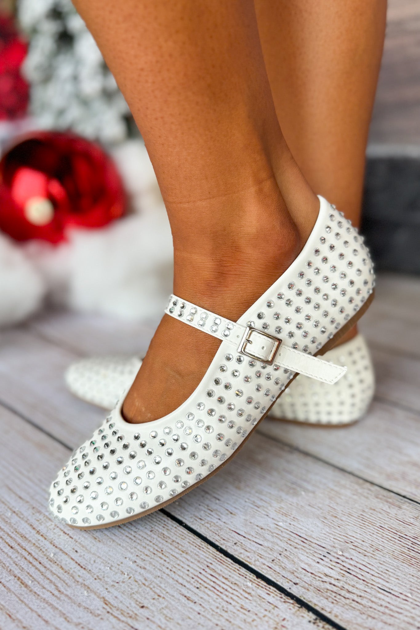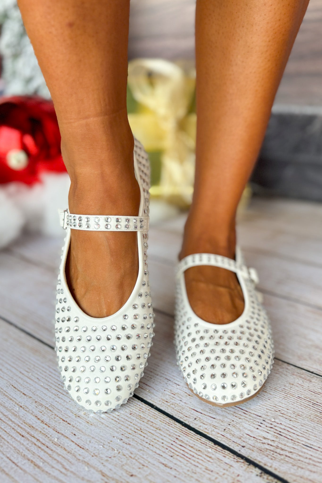 Y'all how FUN are these White Rhinestone Ballet Flats?! The rhinestone elevate your look and the flat design provides you chic comfort! Style with denim shorts and a poplin top to watch the sunset or gift to your favorite bride this summer to wear at her reception. The styling options are endless!