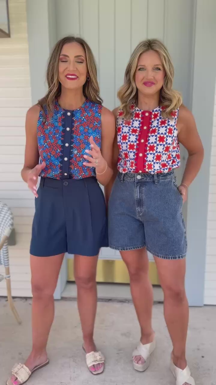 The SWEETEST revision coming your way! Introducing the SSYS Sleeveless Everly Scallop Trim Top In White Red Patchwork! The most PERFECT crisp, clean, sophisticated but still can go causal for all your Memorial Day and 4th of July events. Everly's signature scallop detailing and pearl buttons steal the show while her fit is easy and true to size. Style with trouser shorts, white denim or your fave denim shorts for an effortless and themed OOTD! Shop our BOTTOMS and SHOES to build your look!